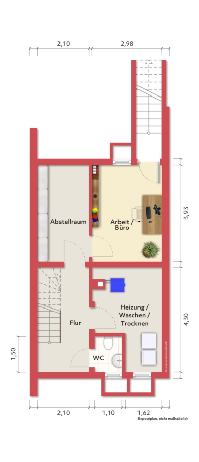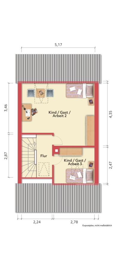 Im EG Küche mit Essplatz & Wohnzimmer mit Terrasse & Garten, im OG 2 Schlafzimmer m. Balkon & Bad, im DG zwei weitere Zimmer je mit 1 Dachflächenfenster.